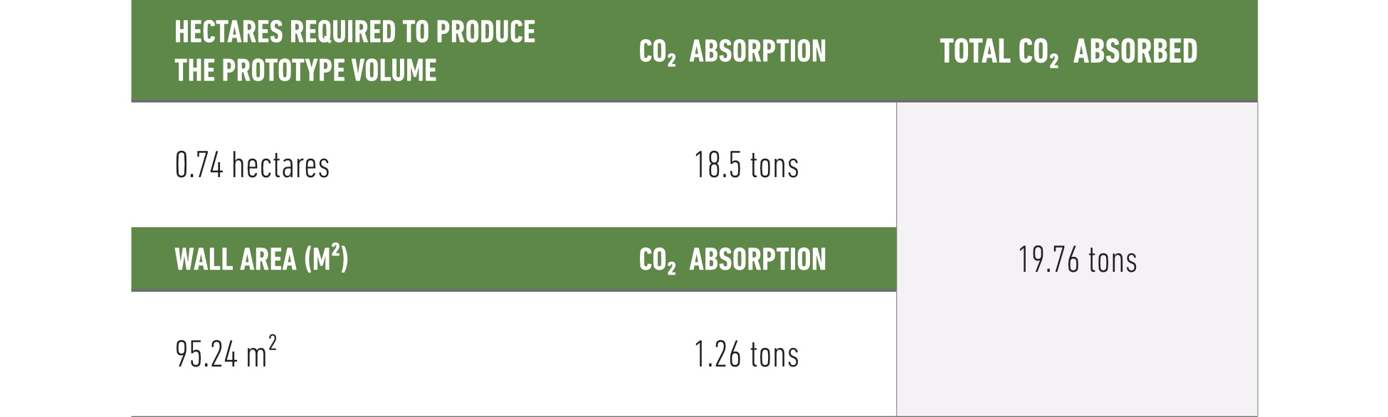 This table shows the carbon absorbed when using hempcrete in wall construction.