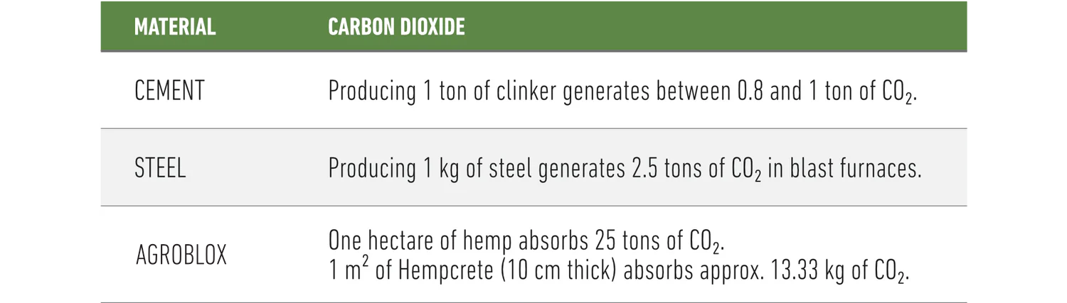While conventional materials emit CO₂ during manufacturing, Bagacrete absorbs more carbon than it produces—thanks to hemp cultivation and lime carbonation.
